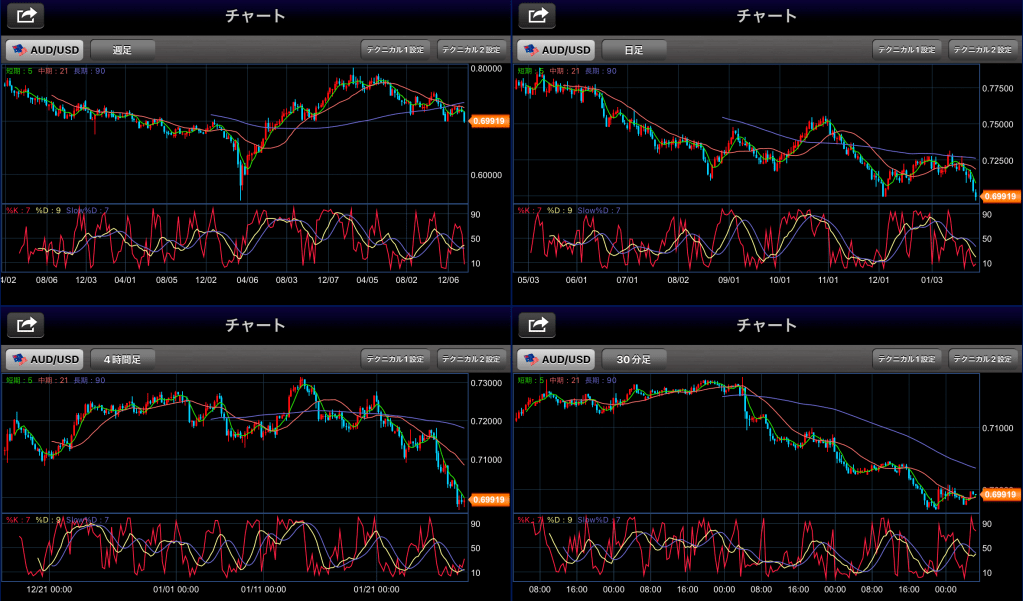 今週はドル高になりました。週足で見るとかなり下げたように見えます。0.7000を割り込んで終わったのですが、来週以降ぐっと下がっていくか、一旦戻すかというところです。チャートでは、支えがないので下がるとどこまでいくのやら・・・当面大きな話題がなければ戻り売りしか選択できない感じです。